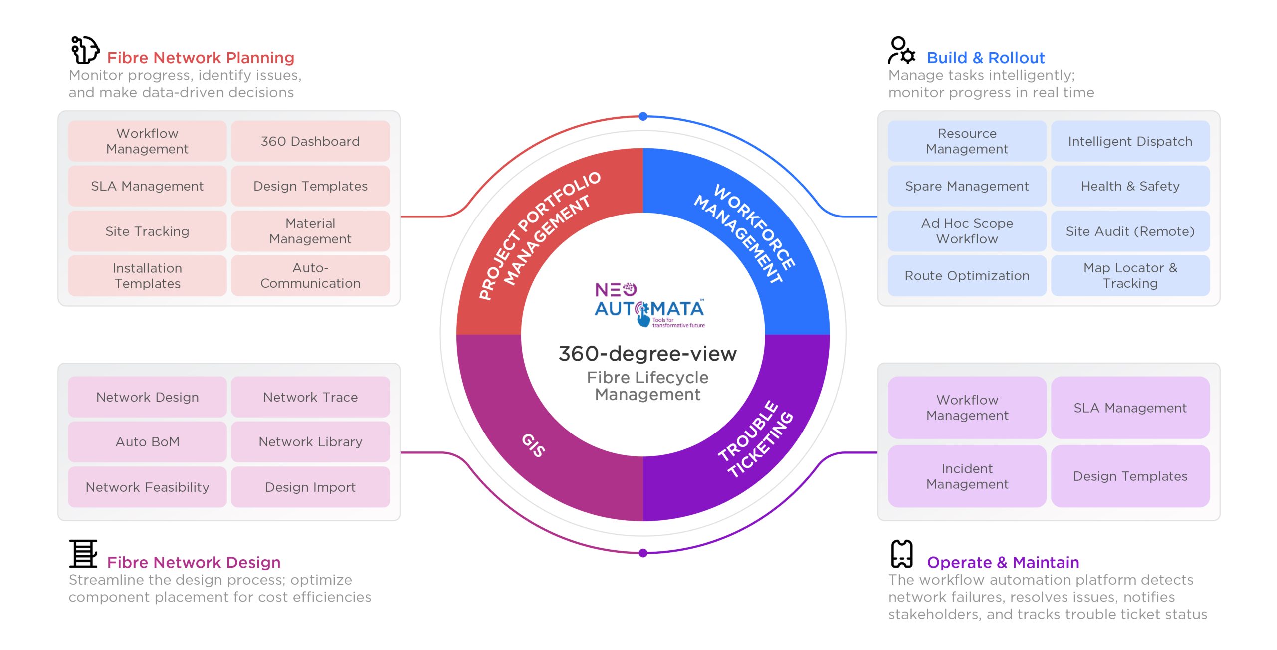 Designed with these challenges in mind, NeoAutomata™ Fibre Lifecycle Management (FLM) simplifies fibre deployment for both greenfield and brownfield environments. It offers CSPs a 360-degree visibility and control across every stage of the process—from planning and design to build and maintenance, helping eliminate bottlenecks, reduce operational costs, and make smarter decisions—faster.